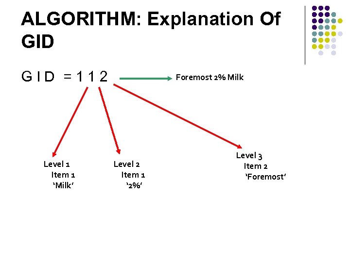 ALGORITHM: Explanation Of GID =112 Level 1 Item 1 ‘Milk’ Foremost 2% Milk Level 2 Item 1 ‘ 2%’ Level 3 Item 2 ‘Foremost’