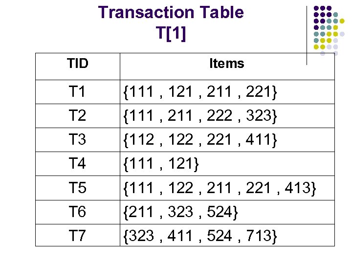 Transaction Table T[1] TID Items T 1 {111 , 121 , 211 , 221} T 2 {111 , 222 , 323} T 3 {112 , 122 , 221 , 411} T 4 {111 , 121} T 5 {111 , 122 , 211 , 221 , 413} T 6 {211 , 323 , 524} T 7 {323 , 411 , 524 , 713}