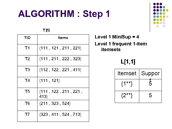 ALGORITHM : Step 1 T [1] TID Items T 1 {111 , 121 , 211 , 221} T 2 {111 , 222 , 323} T 3 {112 , 122 , 221 , 411} T 4 {111 , 121} T 5 {111 , 122 , 211 , 221 , 413} T 6 {211 , 323 , 524} T 7 {323 , 411 , 524 , 713} Level 1 Mini. Sup = 4 Level 1 frequent 1 -itemsets L[1, 1] Itemset Suppor t {1**} 5 {2**} 5