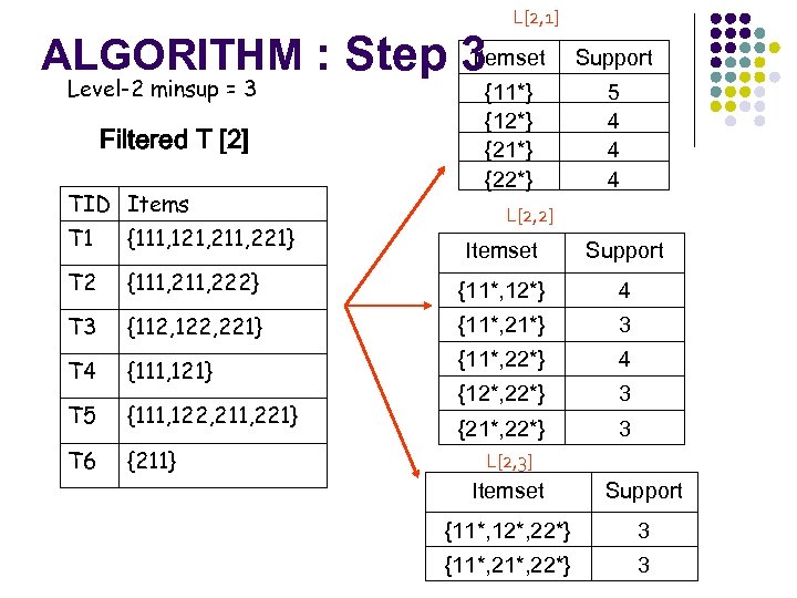 ALGORITHM: Step 2 Filtered T [2] L[1, 1] TID Itemset Suppor t {1**} 5 only keep items in L[1, 1] from T[1] Items T 1 {111, 121, 211, 221} T 2 {111, 222} T 3 {112, 122, 221} Itemset 2]Support L [1, T 4 {111, 121} T 5 {111, 122, 211, 221} {1**, 2**} T 6 {211} {2**} 5 4