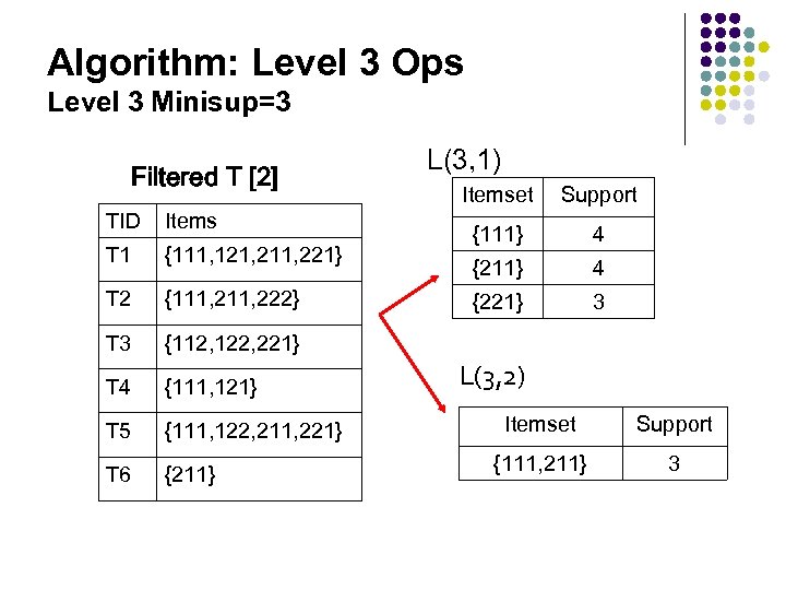 Algorithm: Level 3 Ops Level 3 Minisup=3 Filtered T [2] TID Items T 1 {111, 121, 211, 221} T 2 {111, 222} T 3 {111, 121} T 5 {111, 122, 211, 221} T 6 {211} Itemset Support {111} 4 {221} 3 {112, 122, 221} T 4 L(3, 1) L(3, 2) Itemset Support {111, 211} 3