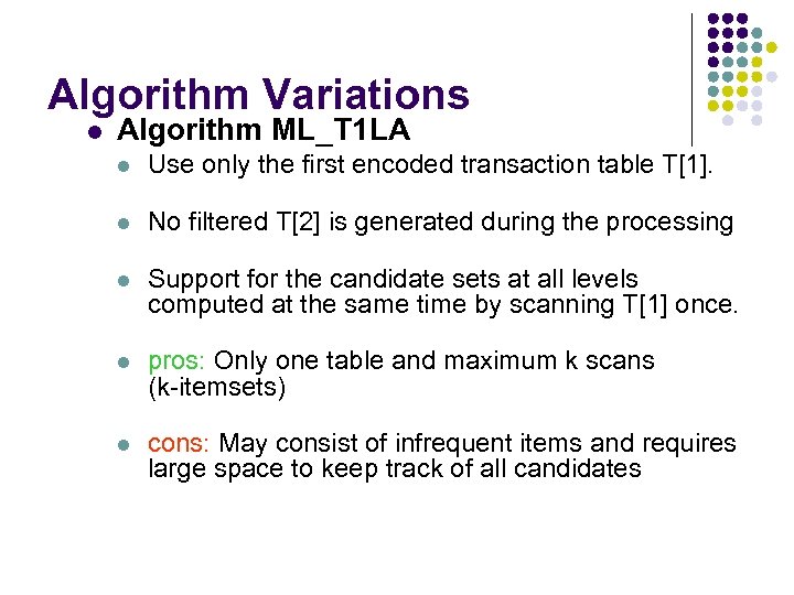 Algorithm Variations l Algorithm ML_T 1 LA l Use only the first encoded transaction table T[1]. l No filtered T[2] is generated during the processing l Support for the candidate sets at all levels computed at the same time by scanning T[1] once. l pros: Only one table and maximum k scans (k-itemsets) l cons: May consist of infrequent items and requires large space to keep track of all candidates