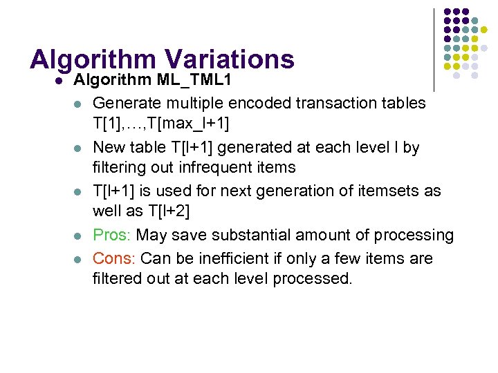 Algorithm Variations l Algorithm ML_TML 1 l Generate multiple encoded transaction tables T[1], …, T[max_l+1] l New table T[l+1] generated at each level l by filtering out infrequent items l T[l+1] is used for next generation of itemsets as well as T[l+2] l Pros: May save substantial amount of processing l Cons: Can be inefficient if only a few items are filtered out at each level processed.