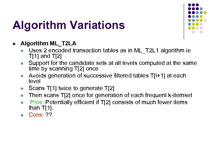 Algorithm Variations l Algorithm ML_T 2 LA l Uses 2 encoded transaction tables as in ML_T 2 L 1 algorithm ie T[1] and T[2] l Support for the candidate sets at all levels computed at the same time by scanning T[2] once l Avoids generation of successive filtered tables T[l+1] at each level l Scans T[1] twice to generate T[2] l Then scans T[2] once for generation of each frequent k-itemset l Pros: Potentially efficient if T[2] consists of much fewer items than T[1]. l Cons: ? ?