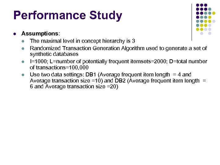Performance Study l Assumptions: l l The maximal level in concept hierarchy is 3 Randomized Transaction Generation Algorithm used to generate a set of synthetic databases I=1000; L=number of potentially frequent itemsets=2000; D=total number of transactions=100, 000 Use two data settings: DB 1 (Average frequent item length = 4 and Average transaction size =10) and DB 2 (Average frequent item length = 6 and Average transaction size =20)