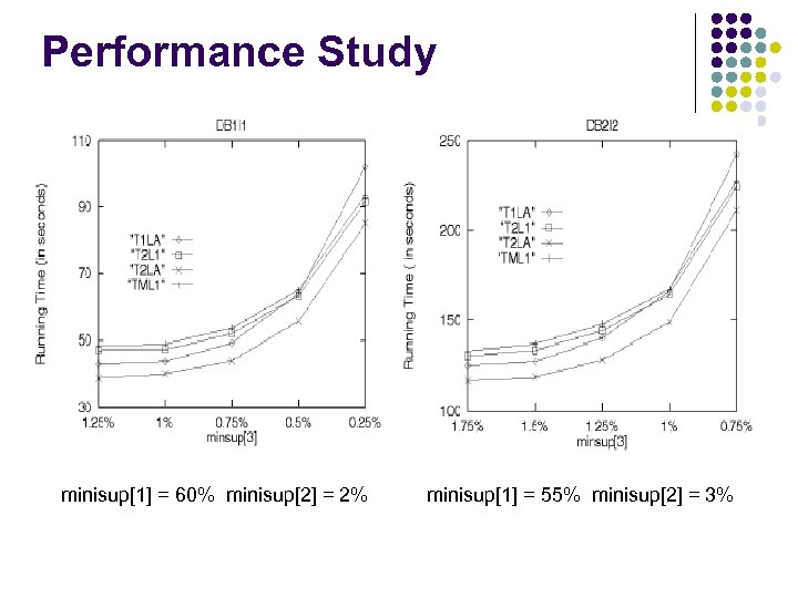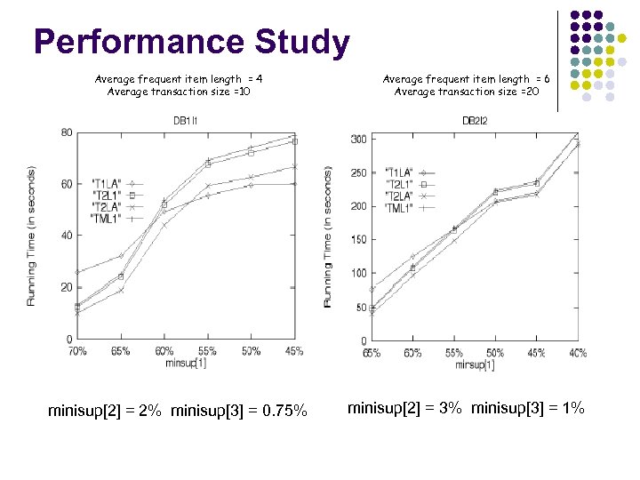 Performance Study Average frequent item length = 4 Average transaction size =10 minisup[1] = 60% minisup[3] = 0. 75% Average frequent item length = 6 Average transaction size =20 minisup[1] = 55% minisup[3] = 1%