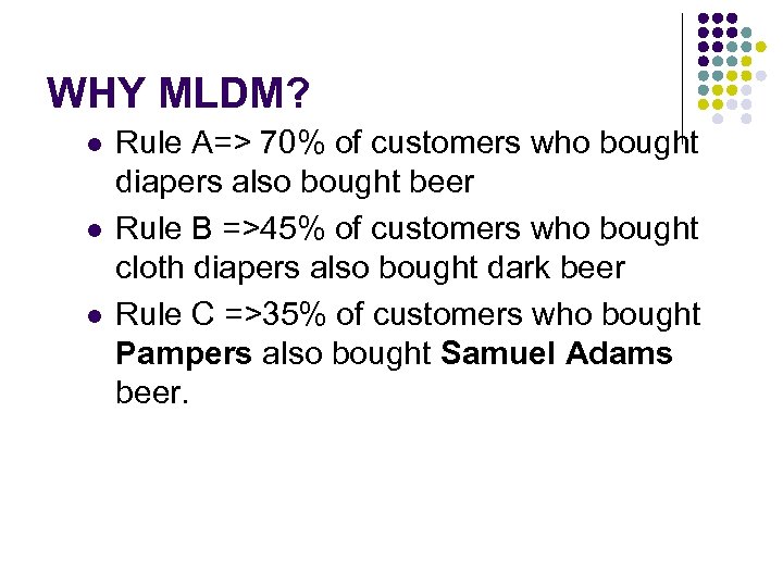 WHY MLDM? l l l Rule A=> 70% of customers who bought diapers also bought beer Rule B =>45% of customers who bought cloth diapers also bought dark beer Rule C =>35% of customers who bought Pampers also bought Samuel Adams beer.