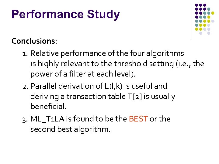 Performance Study Conclusions: 1. Relative performance of the four algorithms is highly relevant to the threshold setting (i. e. , the power of a filter at each level). 2. Parallel derivation of L(l, k) is useful and deriving a transaction table T[2] is usually beneficial. 3. ML_T 1 LA is found to be the BEST or the second best algorithm.
