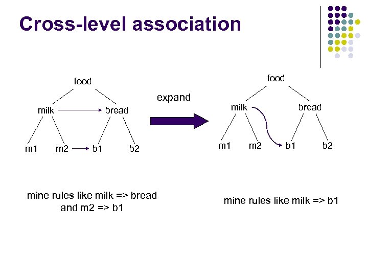 Cross-level association food expand milk m 1 milk bread m 2 b 1 b 2 mine rules like milk => bread and m 2 => b 1 m 1 bread m 2 b 1 b 2 mine rules like milk => b 1