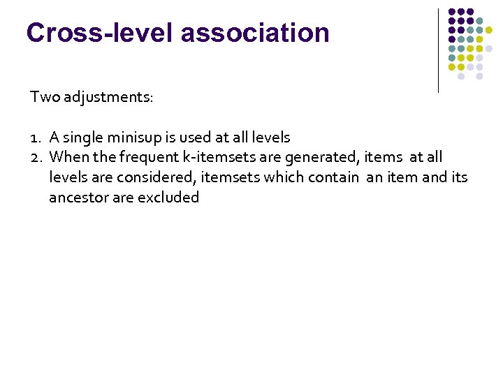 Cross-level association Two adjustments: 1. A single minisup is used at all levels 2. When the frequent k-itemsets are generated, items at all levels are considered, itemsets which contain an item and its ancestor are excluded