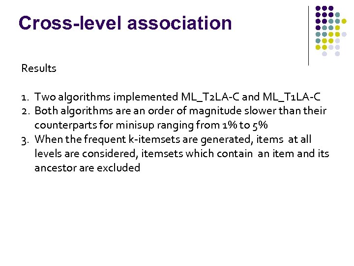 Cross-level association Results 1. Two algorithms implemented ML_T 2 LA-C and ML_T 1 LA-C 2. Both algorithms are an order of magnitude slower than their counterparts for minisup ranging from 1% to 5% 3. When the frequent k-itemsets are generated, items at all levels are considered, itemsets which contain an item and its ancestor are excluded