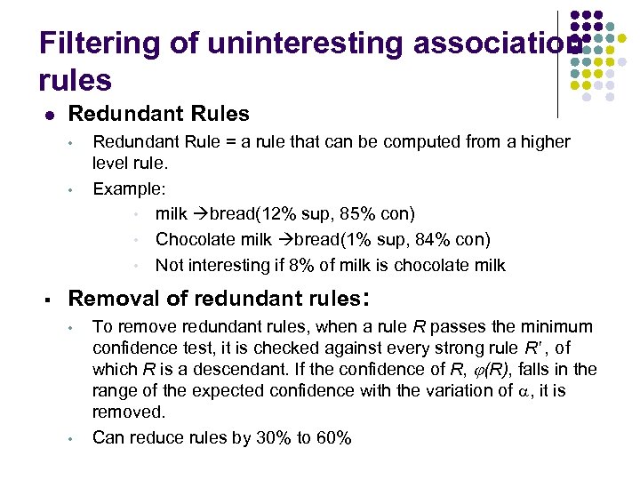 Filtering of uninteresting association rules l Redundant Rules • • § Redundant Rule = a rule that can be computed from a higher level rule. Example: • milk bread(12% sup, 85% con) • Chocolate milk bread(1% sup, 84% con) • Not interesting if 8% of milk is chocolate milk Removal of redundant rules: • • To remove redundant rules, when a rule R passes the minimum confidence test, it is checked against every strong rule R' , of which R is a descendant. If the confidence of R, (R), falls in the range of the expected confidence with the variation of , it is removed. Can reduce rules by 30% to 60%