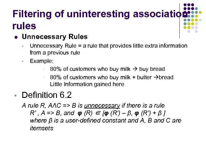 Filtering of uninteresting association rules l Unnecessary Rules • • § Unnecessary Rule = a rule that provides little extra information from a previous rule Example: • 80% of customers who buy milk buy bread • 80% of customers who buy milk + butter bread Little Information gained here Definition 6. 2 A rule R, AΛC => B is unnecessary if there is a rule R’ , A => B, and φ (R) ∈ [φ (R’) – β, φ (R’) + β ] where β is a user-defined constant and A, B and C are itemsets
