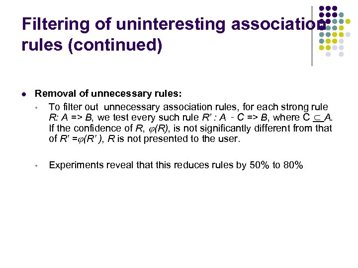 Filtering of uninteresting association rules (continued) l Removal of unnecessary rules: • To filter out unnecessary association rules, for each strong rule R: A => B, we test every such rule R’ : A ‑ C => B, where C ⊂ A. If the confidence of R, (R), is not significantly different from that of R' = (R' ), R is not presented to the user. • Experiments reveal that this reduces rules by 50% to 80%