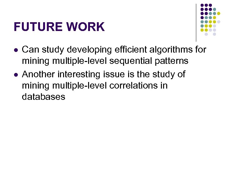 FUTURE WORK l l Can study developing efficient algorithms for mining multiple-level sequential patterns Another interesting issue is the study of mining multiple-level correlations in databases