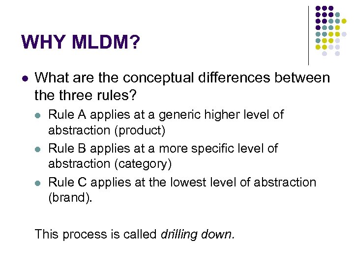 WHY MLDM? l What are the conceptual differences between the three rules? l l l Rule A applies at a generic higher level of abstraction (product) Rule B applies at a more specific level of abstraction (category) Rule C applies at the lowest level of abstraction (brand). This process is called drilling down.
