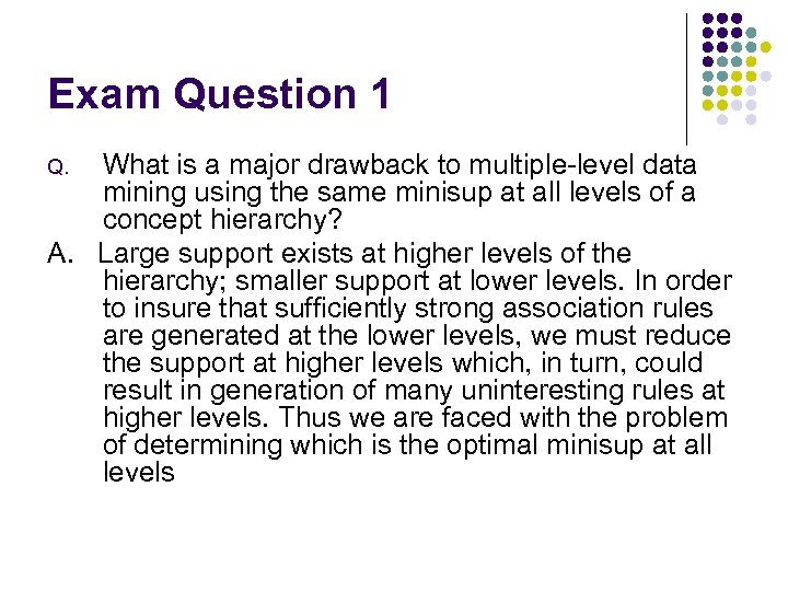 Exam Question 1 What is a major drawback to multiple-level data mining using the same minisup at all levels of a concept hierarchy? A. Large support exists at higher levels of the hierarchy; smaller support at lower levels. In order to insure that sufficiently strong association rules are generated at the lower levels, we must reduce the support at higher levels which, in turn, could result in generation of many uninteresting rules at higher levels. Thus we are faced with the problem of determining which is the optimal minisup at all levels Q.