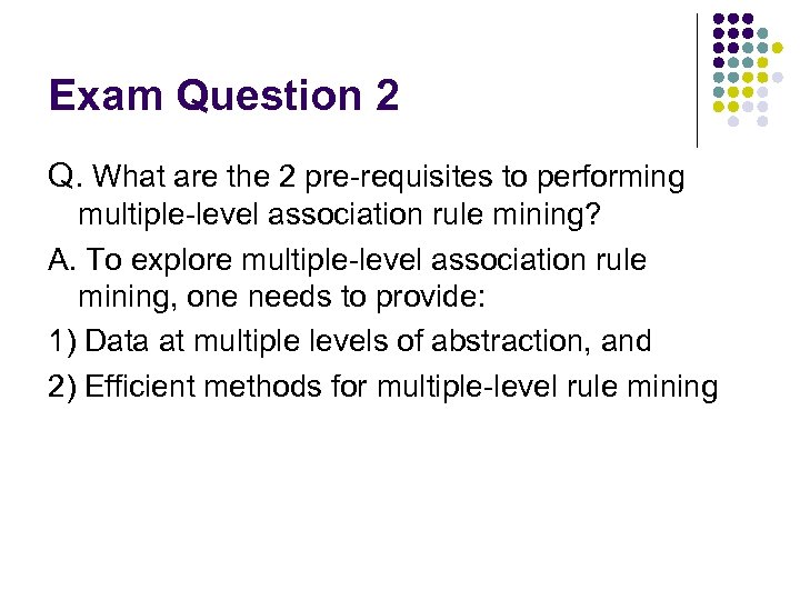 Exam Question 2 Q. What are the 2 pre-requisites to performing multiple-level association rule mining? A. To explore multiple-level association rule mining, one needs to provide: 1) Data at multiple levels of abstraction, and 2) Efficient methods for multiple-level rule mining