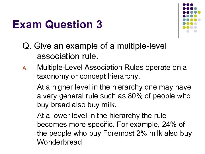 Exam Question 3 Q. Give an example of a multiple-level association rule. A. Multiple-Level Association Rules operate on a taxonomy or concept hierarchy. At a higher level in the hierarchy one may have a very general rule such as 80% of people who buy bread also buy milk. At a lower level in the hierarchy the rule becomes more specific. For example, 24% of the people who buy Foremost 2% milk also buy Wonderbread