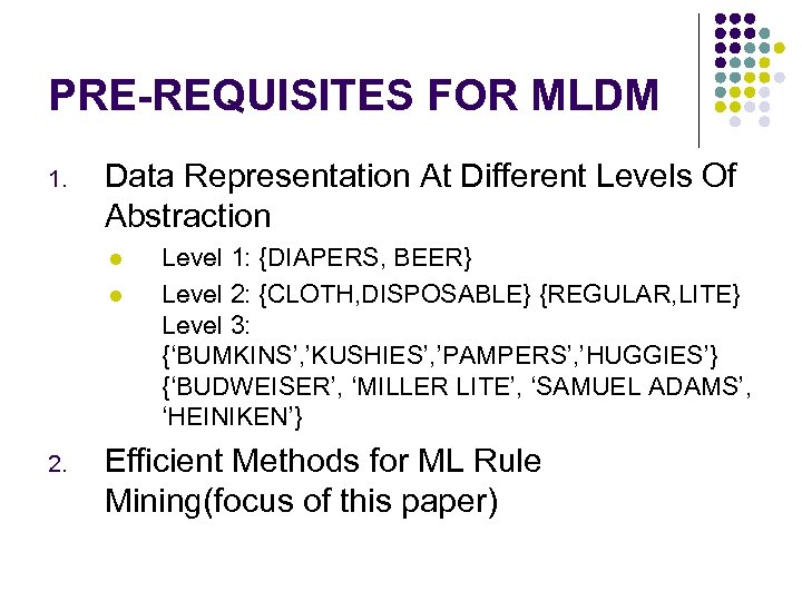 PRE-REQUISITES FOR MLDM 1. Data Representation At Different Levels Of Abstraction l l 2. Level 1: {DIAPERS, BEER} Level 2: {CLOTH, DISPOSABLE} {REGULAR, LITE} Level 3: {‘BUMKINS’, ’KUSHIES’, ’PAMPERS’, ’HUGGIES’} {‘BUDWEISER’, ‘MILLER LITE’, ‘SAMUEL ADAMS’, ‘HEINIKEN’} Efficient Methods for ML Rule Mining(focus of this paper)