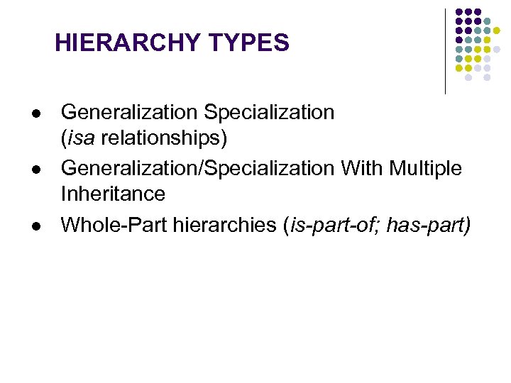 HIERARCHY TYPES l l l Generalization Specialization (isa relationships) Generalization/Specialization With Multiple Inheritance Whole-Part hierarchies (is-part-of; has-part)