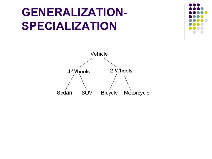 GENERALIZATIONSPECIALIZATION Vehicle 4 -Wheels Sedan SUV 2 -Wheels Bicycle Motorcycle