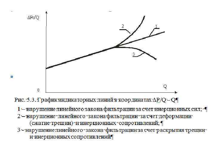 • Индикаторные линии типа 1, имеющие прямолинейную форму, характеризуют линейный закон фильтрации. • Индикаторные линии типа 2 (с выпуклостью к оси дебитов) при забойных давлениях выше давления насыщения нефти газом указывают на наличие зависимости параметров пласта от давления (деформируемые трещины) или на нарушение линейного закона фильтрации в результате влияния инерционных сопротивлений, а также на совместное проявление этих факторов. • Индикаторные линии типа 3, имеющие прямолинейный вид при дебитах и криволинейный при забойных давлениях выше давления насыщения , характерны для составного закона фильтрации жидкости в пласте. • Индикаторные линии типа 4, прямолинейные при забойных давлениях выше давления насыщения и криволинейные с выпуклостью к оси дебитов при , характеризуют фильтрацию газированной жидкости в призабойной зоне пласта при работе на режимах забойных давлений ниже давления насыщения. • Индикаторные линии типа 5 характерны для слоистонеоднородного пласта, коллекторы которого подключаются к работе только при определенных депрессиях на пласт.