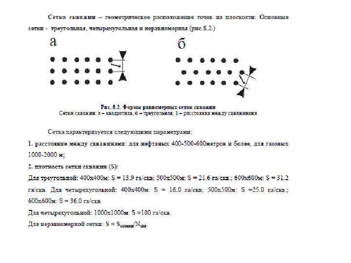 Категории скважин для разработки месторождений К бездействующему фонду относятся скважины, не дававшие продукцию (не находившиеся под закачкой) в последнем месяце отчетного периода. В бездействующем фонде отдельно учитываются скважины, остановленные в отчетном году и до начала отчетного года. Размещение скважин. Плотность сетки скважин Сетка скважин – геометрическое расположение точек на плоскости. Основные сетки - треугольная, четырехугольная и неравномерная Сетка характеризуется следующими параметрами: 1. Расстояние между скважинами: Для нефтяных 400 -500 -600 метров и более, для газовых 1000 -2000 м; 2. Плотность сетки скважин (S): Для треугольной: 400 х400 м: S = 13. 9 га/скв; 500 х500 м: S = 21. 6 га/скв. ; 600 х600 м: S = 31. 2 га/скв.