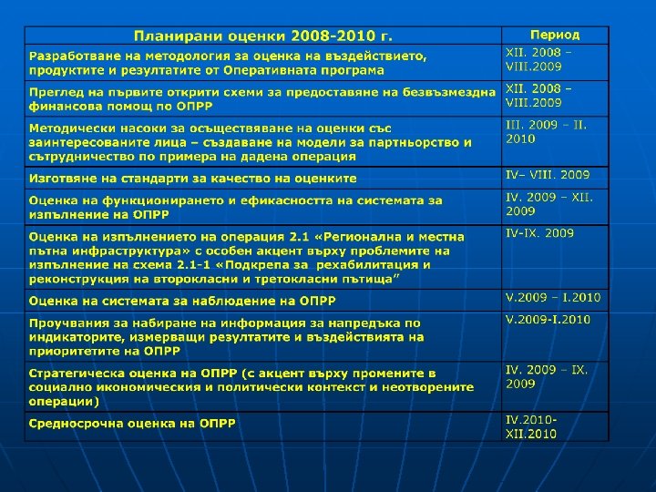 Независимост на оценяването n n n В съответствие с принципа за независимост заложен в чл. 47 [3] на Регламент на Съвета (EО) No 1083/2006, планираните оценки ще се осъществяват от експерти или органи, които са функционално независими от сертифициращите и одитиращите органи. В по-голямата част от случаите в съответствие с международно приетите стандарти оценителите ще бъдат независими и от Управляващия орган на ОПРР. Предвижда се преобладаващата част от оценките на ОПРР да бъдат извършвани от външни оценители, подбрани чрез процедури по Закона за обществените поръчки на основата на ясно дефинирани критерии, гарантиращи качество и професионализъм.