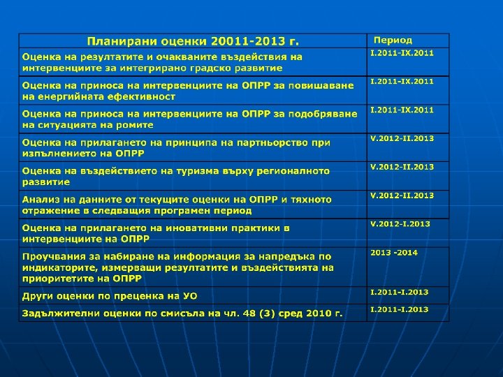 Разпространение на окончателни резултати, изводи и препоръки от оценките n Цялостните доклади от оценките се предоставят на ключови заинтересовани, например отдели в УО и членове на КН. n Резюме от докладите на български и английски език се публикува в официалния сайт на Оперативната програма. n Работни срещи, дискусии, семинари ще се провеждат по преценка за по-широко обсъждане на резултатите и препоръките от оценките. n n n Други информационни материали (брошури, бюлетини, публикации, прес-съобщения и др. ) ще се изготвят по преценка за по-широко разпространение. Годишният преглед на осъществените оценки, техните основни резултати и препоръки се публикува (изцяло или в резюме) на официалния сайт на ОПРР. Основните резултати от оценките се включват в годишния доклад за изпълнението на ОПРР по чл. 67 от Регламент 1083/ 2006