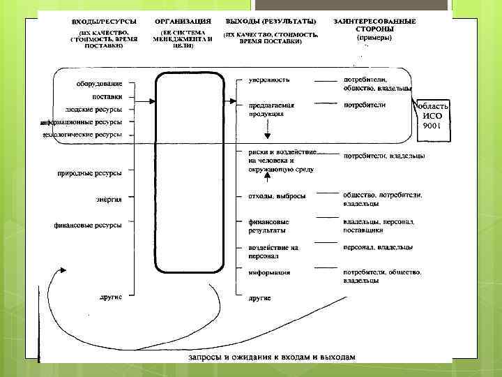 11 Направленность систем менеджмента качества и других систем менеджмента Система менеджмента качества является частью системы менеджмента организации. НИЖЕ на рисунке представлена «Модель, разъясняющая ориентацию системы менеджмента качества и других систем менеджмента» . Где (в центре) представлена организация, которая имеет систему менеджмента и цели. Организация имеет входы (ресурсы), например оборудование, информационные ресурсы, природные ресурсы и другие. Кроме того, организация имеет выходы (результаты), например, продукция, отходы, информация и другие. Этими выходами (результатами) пользуются различные заинтересованные стороны или результаты организации воздействуют на них, например, продукцию используют потребители; отходы воздействуют на общество и т. д. На рисунке представлена область системы менеджмента качества (ИСО 9001). Ниже располагаются другие системы менеджмента организации