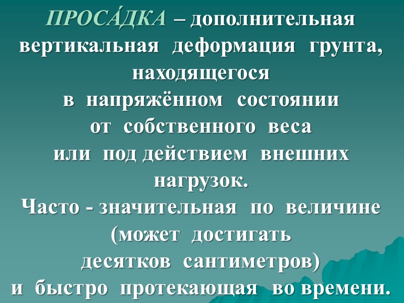 ПРОСÁДКА – дополнительная вертикальная деформация грунта, находящегося в напряжённом состоянии от собственного веса или под действием внешних нагрузок. Часто - значительная по величине (может достигать десятков сантиметров) и быстро протекающая во времени.