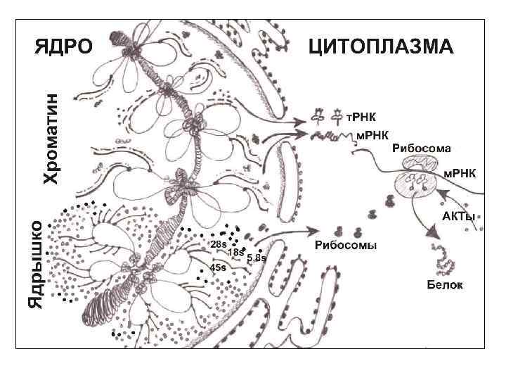 • 4. 1. Синтез РНК. • Необходим синтез и процессинг 3 форм РНК – и. РНК, т. РНК, р. РНК (не считая регуляторных мя. РНК). • Гены пре-и. РНК (10 -80 s РНК) локализованы диффузно по эухроматину всех хромосом. Это уникальные или умеренно (10 -20) повторенные последовательности; в геноме человека около 25 тыс. таких генов. Пре-и. РНК – подвергается процессингу и сплайсингу в перихроматиновых гранулах – информоферах (разрушается до 80 -90 % интронной РНК). Готовая и. РНК (сшитые экзонные фрагменты) выходит через ядерные поры в цитоплазму, связывается с новыми белками и образует информосомы. • Гены пре-т. РНК (4 s РНК) – локализованы так же диффузно; это умеренные повторы. В геноме 61 вид генов т. РНК (по числу кодонов). Процессинг идет без сплайсинга. • Гены пре-р. РНК (45 s РНК) – локализованы в ядрышках (ЯОР, NOR), они присутствуют в фибриллярных центрах и фибриллярном компоненте ядрышка. Это 1 вид гена, он образует умеренные повторы. У человека до 500 повторов в 5 парах хромосом. 45 s РНК процессирует без сплайсинга до 18 s, 28 s и 5, 8 s р. РНК. (5 s р. РНК синтезируется на других хромосомах).