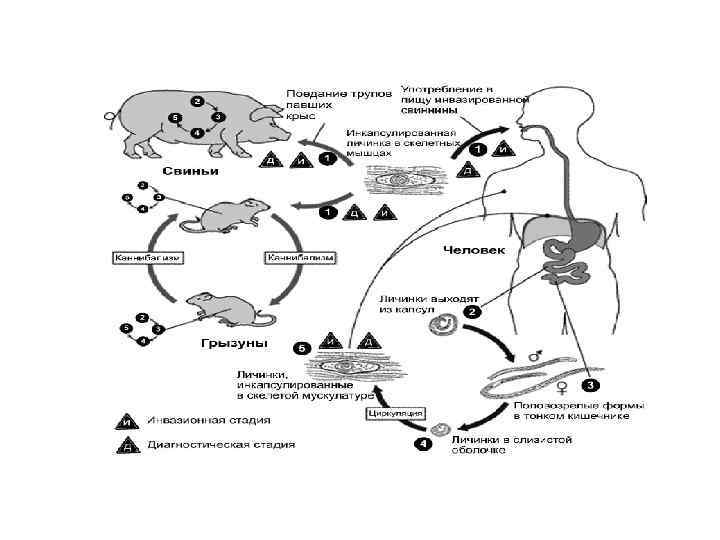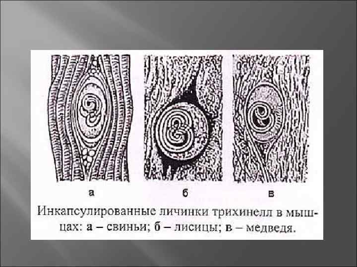Возбудитель Самец длинной 1. 4 -1. 6 мм, шириной 0. 14 мм. Самка вдвое крупнее - 3 -4 мм длинны, живородящие. Червь может поражать любые виды млекопитающих. Если животное ест мясо, которое содержит цисты, кислота в желудке растворяет покрытие, освобождая червей. Черви находятся в тонком кишечнике, и в течение 1 -2 дней становятся зрелыми. После спаривания женские особи производят личинок. Личинки могут проникнуть в любую клетку, но могут выжить только в скелетных