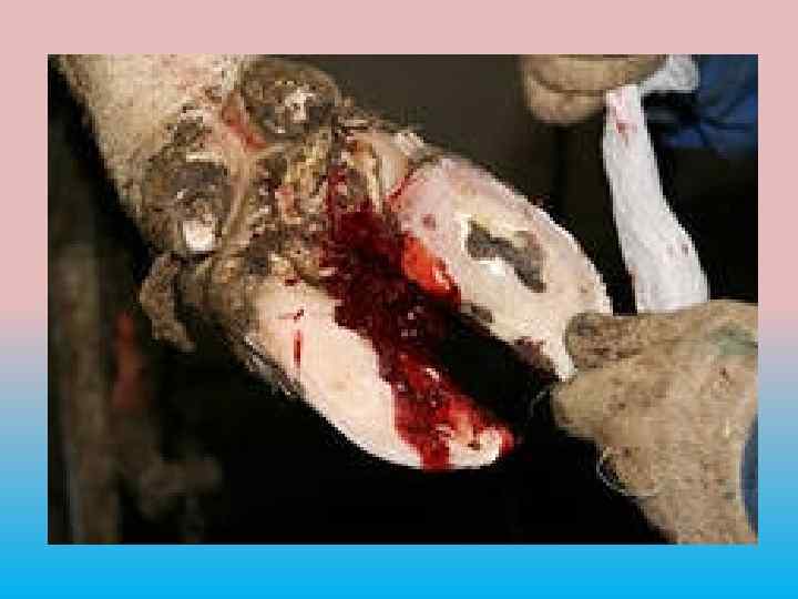 У крупного рогатого скота, оленей и овец чаще поражаются дистальные участки кожи задних конечностей, как более подверженные травмированию и воздействию кала и мочи. На месте проникновения возбудителя отмечается гиперемия кожи, с последующим развитием гнойно -некротического воспаления. Процесс с мягких тканей переходит на надкостницу, кости, связки, сухожилия, что иногда приводит к отпадению фаланг пальцев.