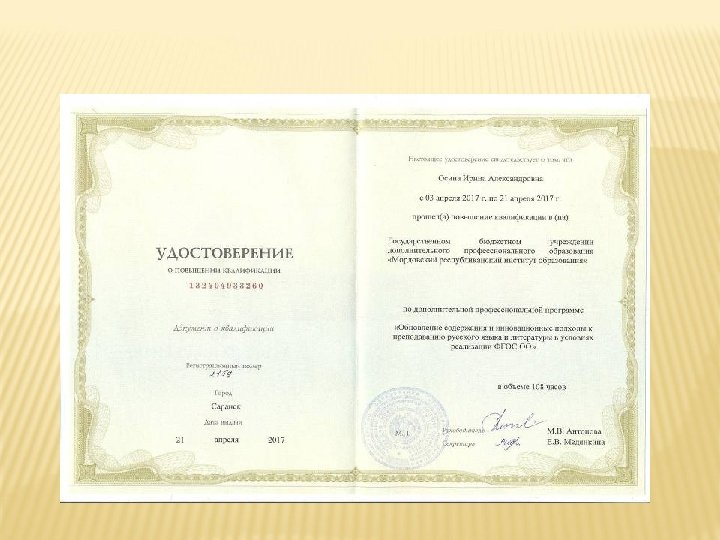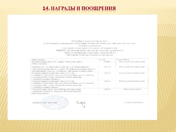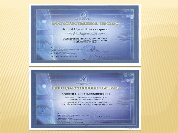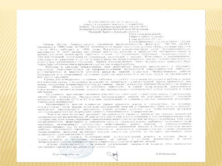 Министерство образования Республики Мордовия Портфолио Осиной Ирины Александровны, учителя русского языка и литературы МБОУ «Поселковская средняя школа № 1» Дата рождения: 20 февраля 1969 года Профессиональное образование: учитель русского языка и литературы, МГПИ им. М. Е. Евсевьева, Диплом УВ № 325772, дата выдачи 7 июля 1990 года Стаж педагогической работы: 27 лет Общий трудовой стаж: 27 лет Наличие квалификационной категории: первая Дата последней аттестации: 2012 год