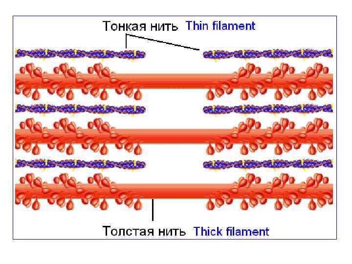С нитями актина связаны регуляторные белки мышечной ткани - тропомиозин и тропонин