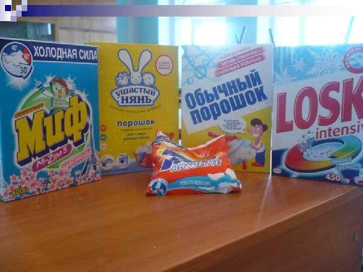 Результаты исследований Название порошка Интенсив ность запах а р. Н Растворен ие в воде Пенообраз овани е Отстирыв ающи й эффек т Сумма балов (сред няя) Место «Миф» 3 2 2 2, 4 2 «Ушастый нянь» 1 1 2 4 1 1, 8 1 «Tide» 2 2 5 3 3 3 4 «Обычный порошок» 4 2 1 2 4 2, 8 3 «Losk» 3 2 4 3 5 3, 4 5