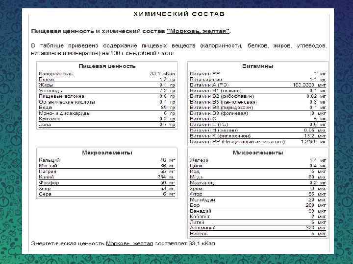 Морковь Очень доступный, недорогой продукт. К тому же – это овощ, а значит в своем составе имеет витамины, которые так необходимы нашему организму каждый день для химических процессов. Все сорта моркови богаты клетчаткой, сахарами, белком, эфирными маслами и содержат жиры. Главная ценность моркови – высокое содержание бета-каротина (провитамина А), витамина С, Е, К и нескольких витаминов группы В – В 1, В 2, В 3, В 6, В 9. Из микро- и макроэлементов морковь содержит калий, кальций, фосфор, медь, хром, цинк, фтор и железо.