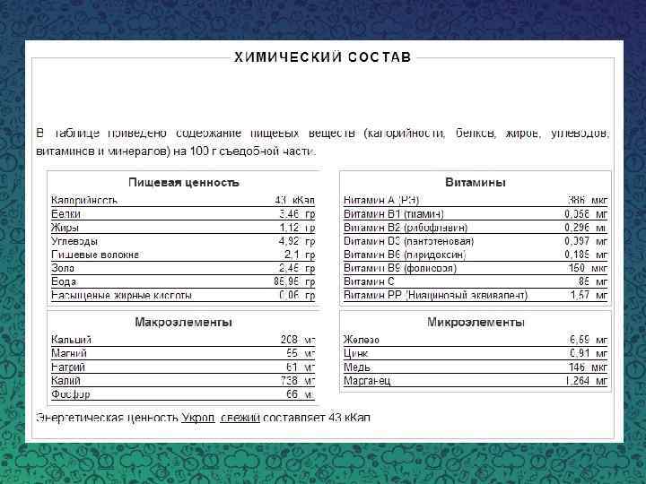 Полезные вещества содержатся во всем растении. Листья укропа богаты на витаминами С, А, В 2, В 6, Р, РР. Они содержат минеральные соли, особенно кальция, калия, фосфора, железа, магния. Растение укропа имеет богатый химический состав и представляет высокую пищевую ценность, к примеру - 50 г укропа энергетически равно 150 г помидор. Благоприятное соединение в укропе солей железа и магния, в легкоусваиваемой форме, усиливает кровотворные процессы. Эфирные масла и экстрактивные вещества способствуют образованию ферментов пищеварения, желчи, мочи и обеспечивают дезинфицирующее действие всему организму, особенно в органах пищеварения и мочеполовой системе.