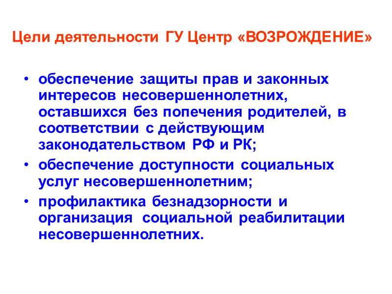 Цели деятельности ГУ Центр «ВОЗРОЖДЕНИЕ» обеспечение защиты прав и законных интересов несовершеннолетних, оставшихся без попечения родителей, в соответствии с действующим законодательством РФ и РК; обеспечение доступности социальных услуг несовершеннолетним; профилактика безнадзорности и организация социальной реабилитации несовершеннолетних.