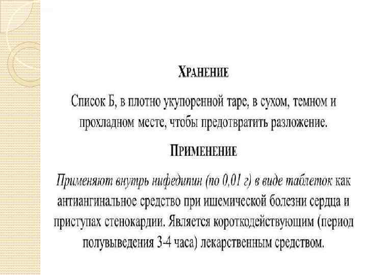 Применение: Антогонист иона калция. Расширяет коронарные и артериальные сосуды. Гипотензивное действие. Ишемическая болезнь сердца. Стенокардия. Хранение При температуре не выше 25 С, взащищенном от света месте.