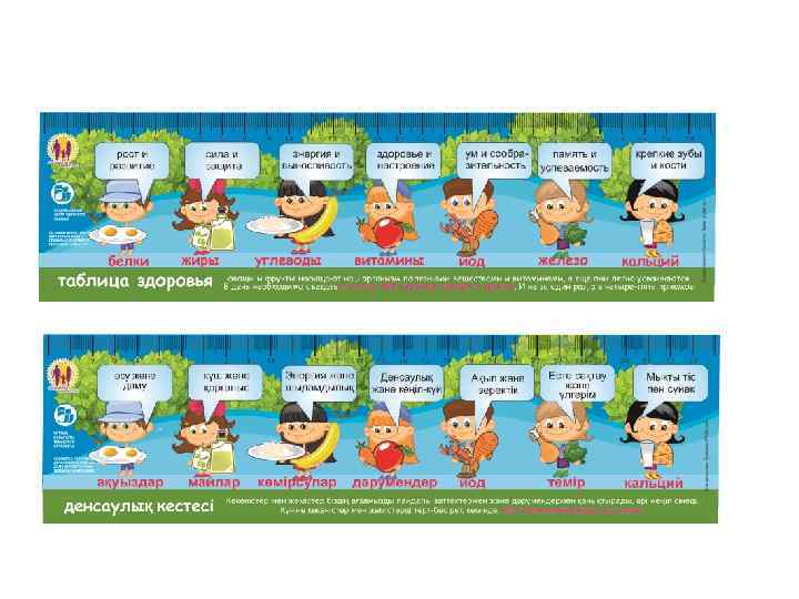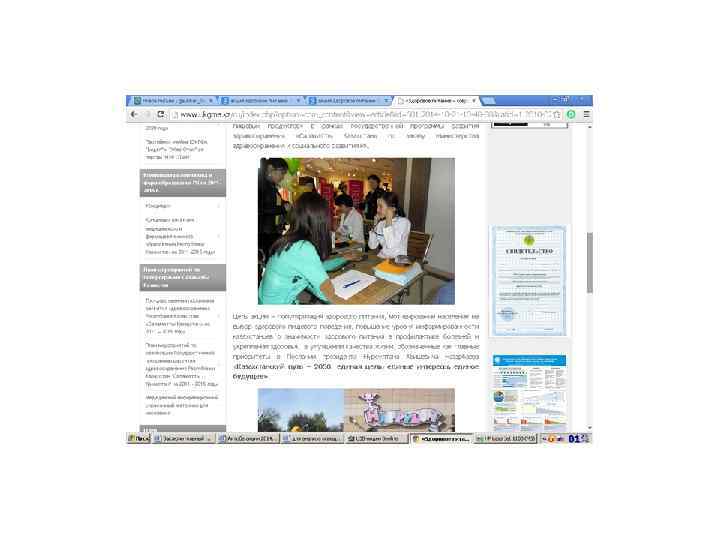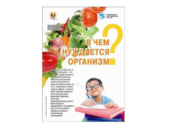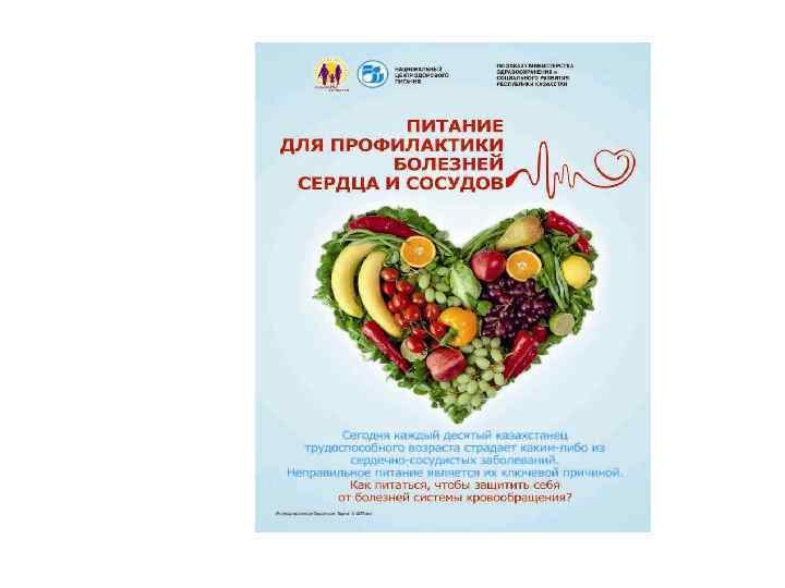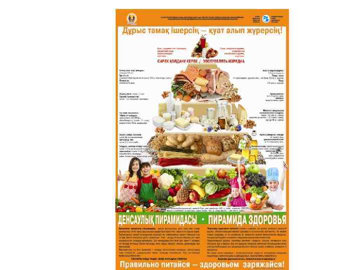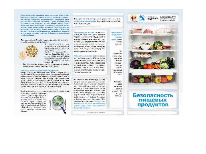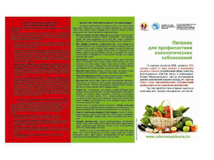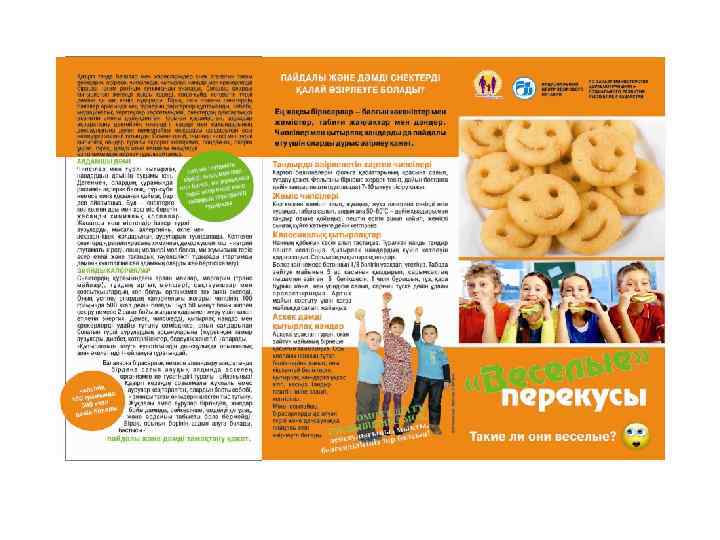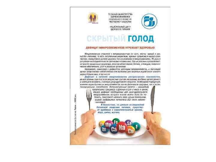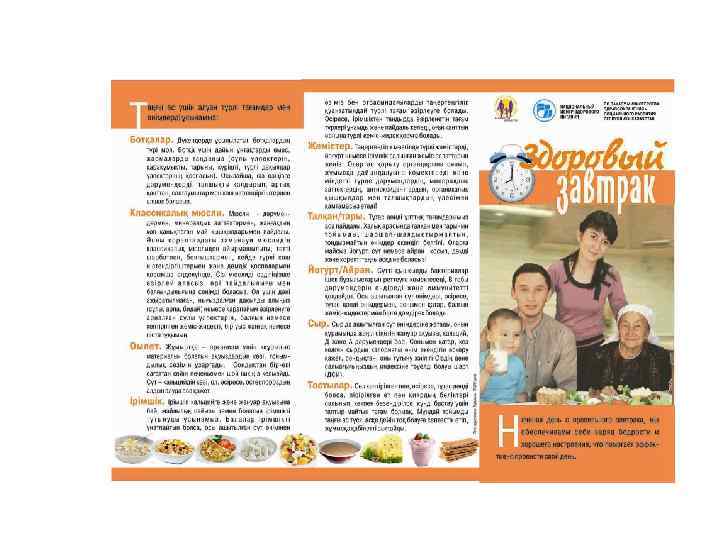 Информационные материалы для населения Разработаны и выпущены 15 видов информационнопросветительских материалов (буклеты, брошюры, листовки, плакаты) общим тиражом 150000 экземпляров о здоровом питании и его значении в предотвращении алиментарно-зависимых заболеваний для следующих целевых групп населения: дети дошкольного и школьного возраста, беременные и женщины репродуктивного возраста, взрослое население. Материалы являются научно-популярными, отличаются красочностью исполнения, распространяются во всех регионах РК (передаются из рук в руки целевым группам населения).