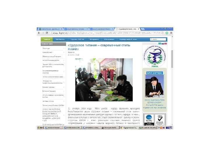 Республиканская акция «Здоровое питание –. современный стиль жизни» • Масштабные акции, проходящие одновременно во всех региональных центрах страны, позволяют привлечь внимание широкой общественности к проблеме влияния питания на здоровье человека, побудить население к выбору правильного пищевого поведения. Акция прошла 11 октября 2014 года в 17 городах Казахстана и охватила 4672 человека. Акция была воспринята населением с большим интересом и получила широкое освещение в СМИ. От гостей акции – специалистов из различных сфер деятельности – были получены положительные рецензии.