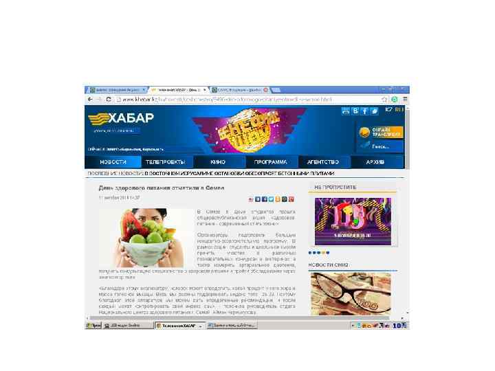 Внедрение вопросов о здоровом питании в интеллектуальную телевикторину для школьников «Лидер-21 века» Агентства Хабар. Примеры вопросов: • Бір алма мен бір стакан коланың калориясы бірдей , шамамен 90 калорий. Екеуінің адам ағзасына әсері қандай? • Чрезмерное увлечение сладкой газированной водой помимо увеличения риска сахарного диабета часто приводит и к этому процессу. (Ответ: ОЖИРЕНИЕ).