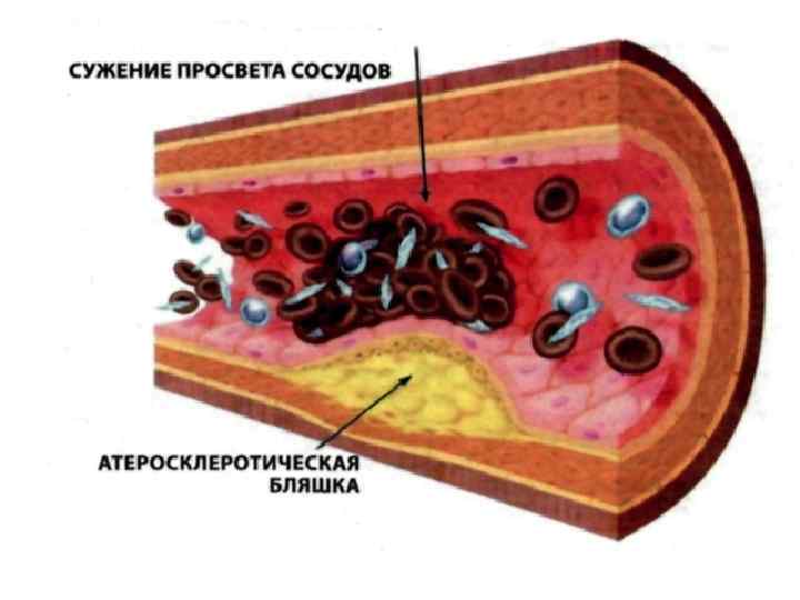 Далее происходит прорастание бляшки фиброзной тканью, клетки под фиброзной оболочкой некротизируются, а ХС откладывается в межклеточном пространстве. На последних стадиях развития бляшка пропитывается солями кальция и становится очень плотной. В области бляшки часто образуются тромбы, перекрывающие просвет сосуда, что приводит к острому нарушению кровообращения в соответствующем участке ткани и развитию инфаркта.