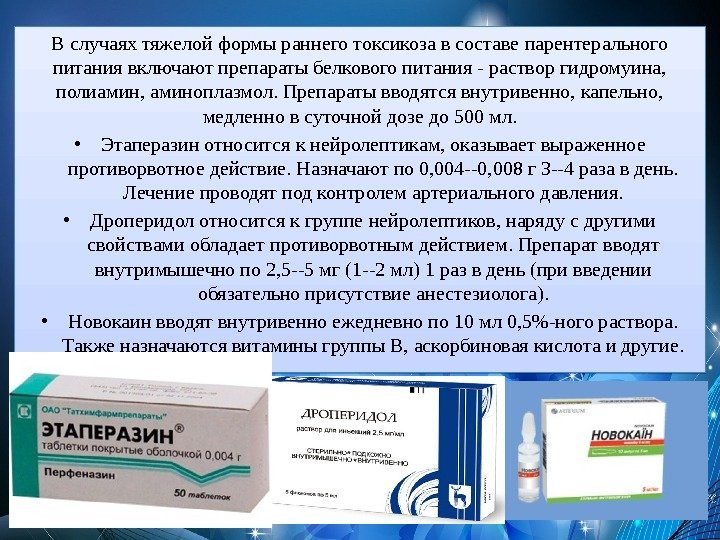 В случаях тяжелой формы раннего токсикоза в составе парентерального питания включают препараты белкового питания — раствор гидромуина, полиамин, аминоплазмол. Препараты вводятся внутривенно, капельно, медленно в суточной дозе до 500 мл. • Этаперазин относится к нейролептикам, оказывает выраженное противорвотное действие. Назначают по 0, 004 —0, 008 г 3 —4 раза в день. Лечение проводят под контролем артериального давления. • Дроперидол относится к группе нейролептиков, наряду с другими свойствами обладает противорвотным действием. Препарат вводят внутримышечно по 2, 5 —5 мг (1 —2 мл) 1 раз в день (при введении обязательно присутствие анестезиолога). • Новокаин вводят внутривенно ежедневно по 10 мл 0, 5%-ного раствора. Также назначаются витамины группы В, аскорбиновая кислота и другие.