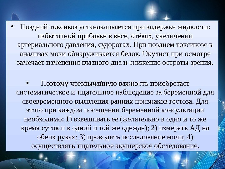 • Поздний токсикоз устанавливается при задержке жидкости: избыточной прибавке в весе, отёках, увеличении артериального давления, судорогах. При позднем токсикозе в анализах мочи обнаруживается белок. Окулист при осмотре замечает изменения глазного дна и снижение остроты зрения. • Поэтому чрезвычайную важность приобретает систематическое и тщательное наблюдение за беременной для своевременного выявления ранних признаков гестоза. Для этого при каждом посещении беременной консультации необходимо: 1) взвешивать ее (желательно в одно и то же время суток и в одной и той же одежде); 2) измерять АД на обеих руках; 3) проводить исследование мочи; 4) осуществлять тщательное акушерское обследование.
