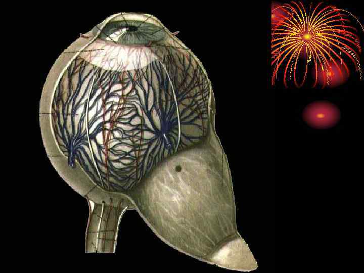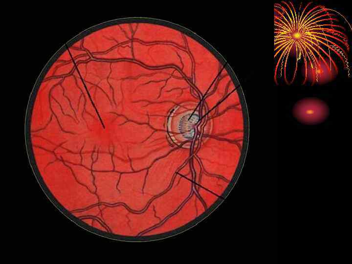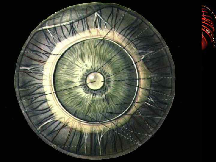 Центральная артерия сетчатки • Отделившись от дуги глазной артерии, направляется вдоль зрительного нерва • На расстоянии 10 -12 мм от глазного яблока она проникает через оболочку нерва в его толщу, где идет по его оси и входит в глаз в центре диска зрительного нерва • На диске артерия делится на 2 ветви – верхнюю и нижнюю, которые в свою очередь делятся на носовые и височные ветви