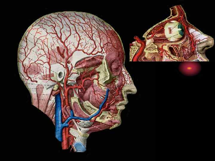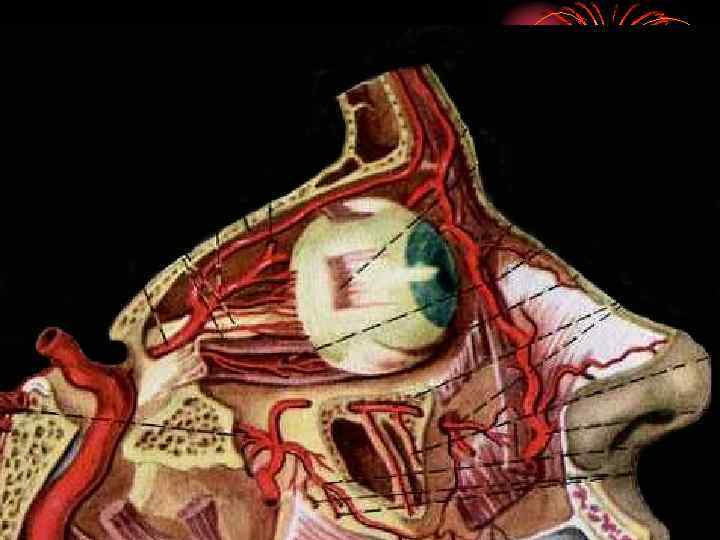 Глазная артерия • Ветвь внутренней сонной артерии • Является основным коллектором питания глаза, глазницы • Проникая в орбиту через канал зрительного нерва, на внутренней стенке орбиты распадается на концевые ветви